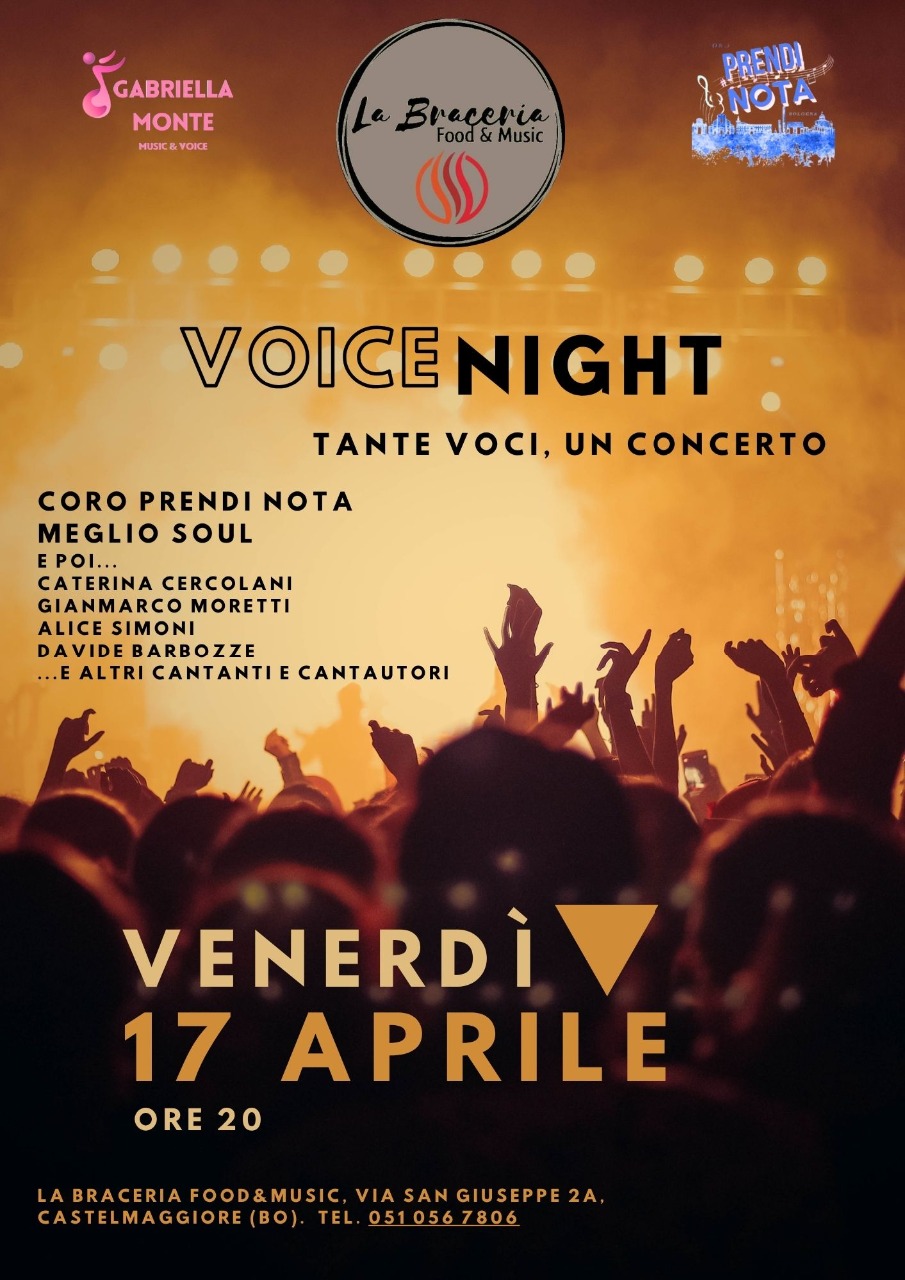 venerdì 17 aprile una serata per chi ama il canto dal vivo, anche corale, con gli artisti emergenti della scuderia di Gabriella Monte e il coro Prendi Nota. sarà anche la serata di lancio del nuovo progetto vocale "Meglio soul" sempre diretto da Gabriella Monte.